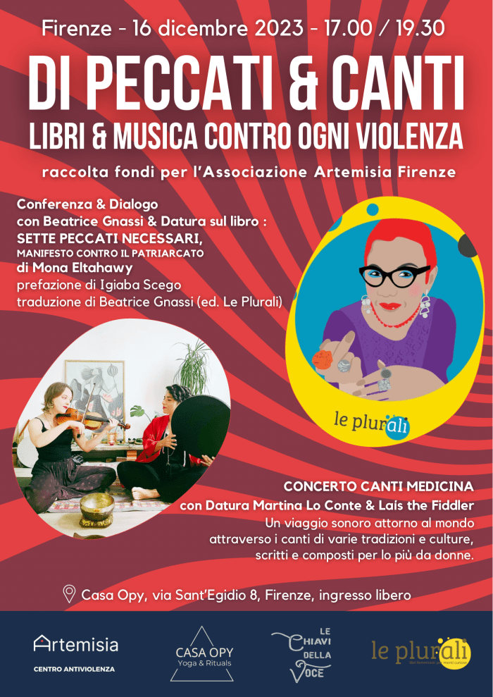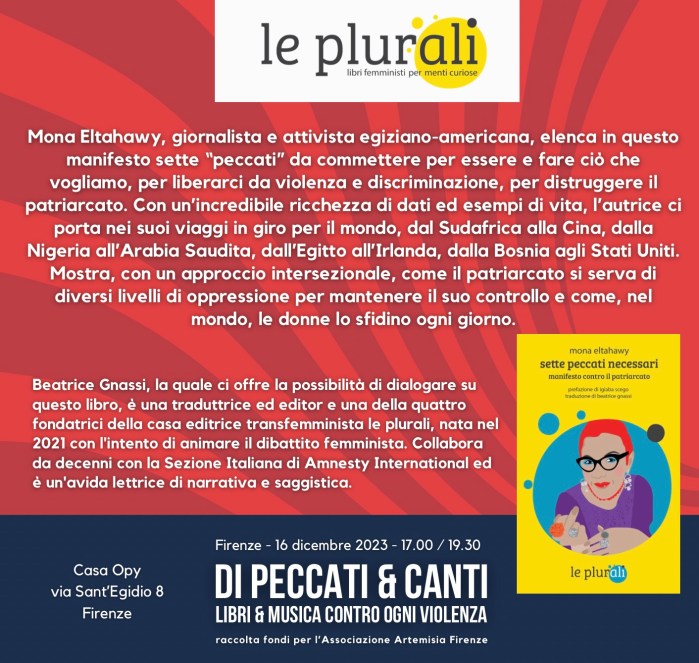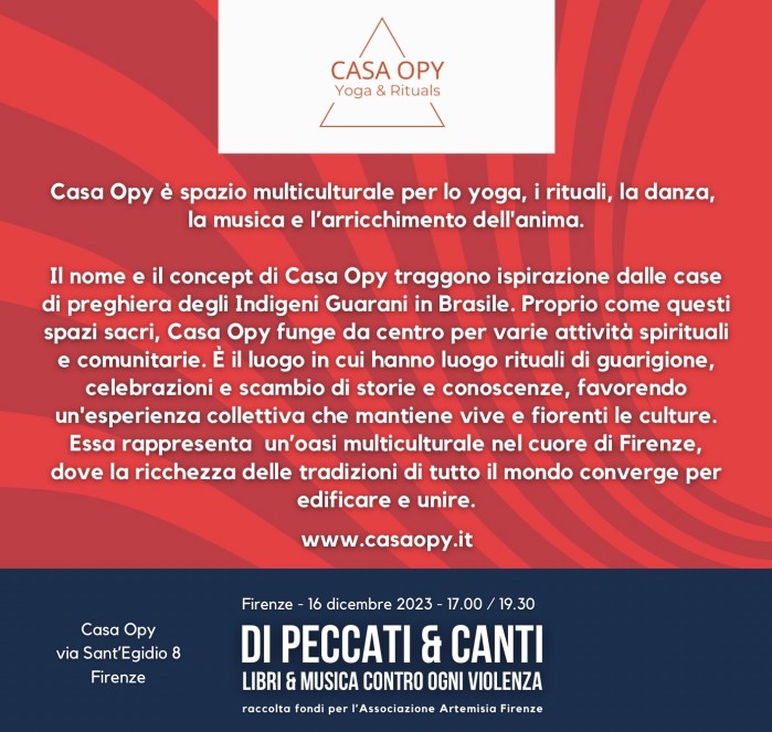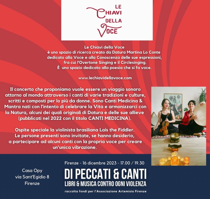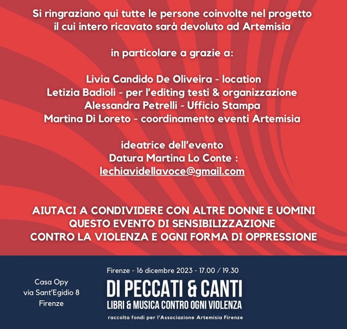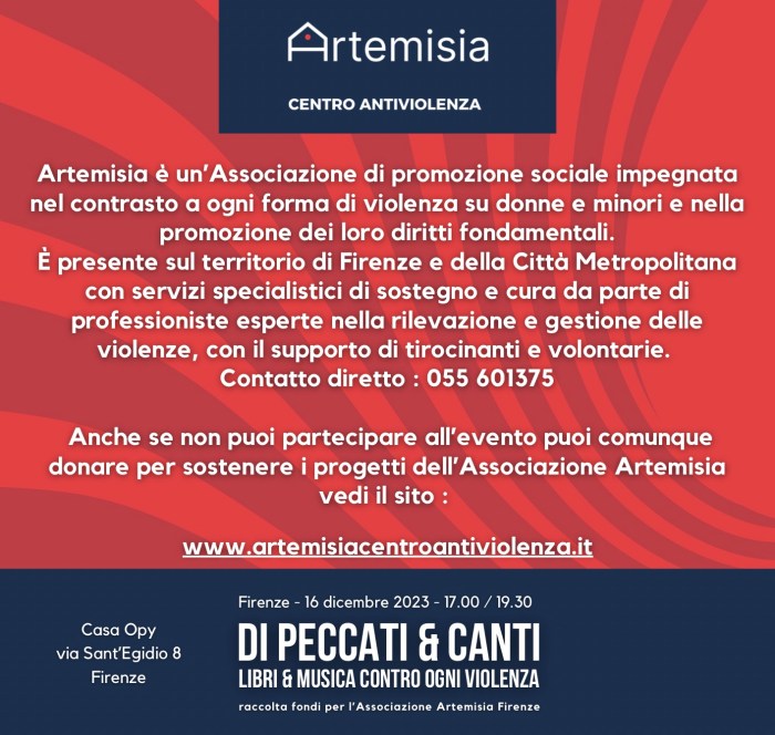Prossimo 16 dicembre 2023 vi invito caldamente a questo evento culturale di beneficienza per l’Associazione Artemisia Firenze che si occupa di proteggere donne e minorenni.