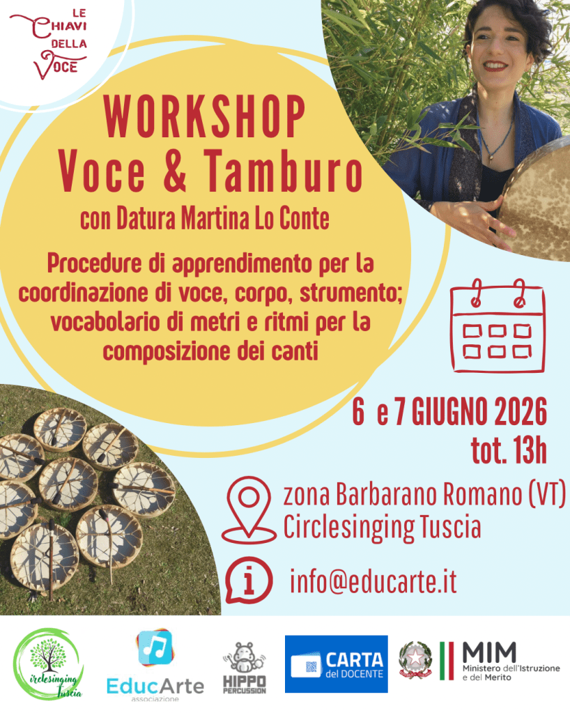 Attraverso la vibrazione della voce e il ritmo del tamburo, possiamo aprire un ponte tra il visibile e lโinvisibile, riconnettendoci con le nostre radici profonde, con la natura, con lo spirito e con lโAltro. Liberare la voce grazie allโimprovvisazione guidata.