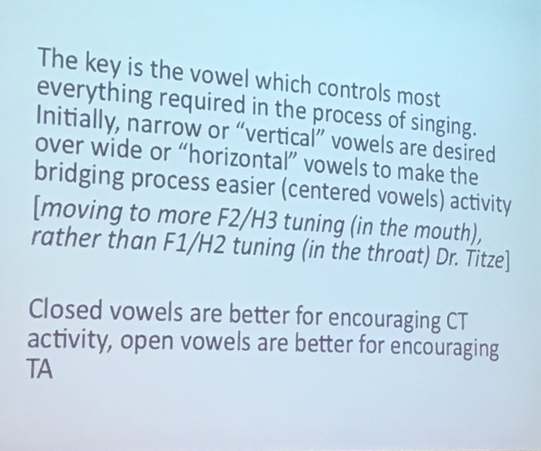 Come ha illustrato Dino Brentali, sotto la guida dell’insegnante in questi esercizi si va per gradi, mantenendo il senso del piccolo e poi andando verso l’apertura graduale della bocca per mantenere lo stesso feeling. Una volta acquisito il bilanciamento si può aprire le vocali. Importante è l’esercizio quotidiano! Poiché si deve creare una nuova memoria muscolare a cui l’allievo si riallaccia per produrre il giusto suono. In genere per negoziare il passaggio dal petto alla testa, si cerca il Mix prima del passaggio di registro, di modo da uniformare i suoni grazie al bilanciamento muscolare. Può essere usata una cannuccia quando serve come ulteriore aiuto (Ingo Titze).