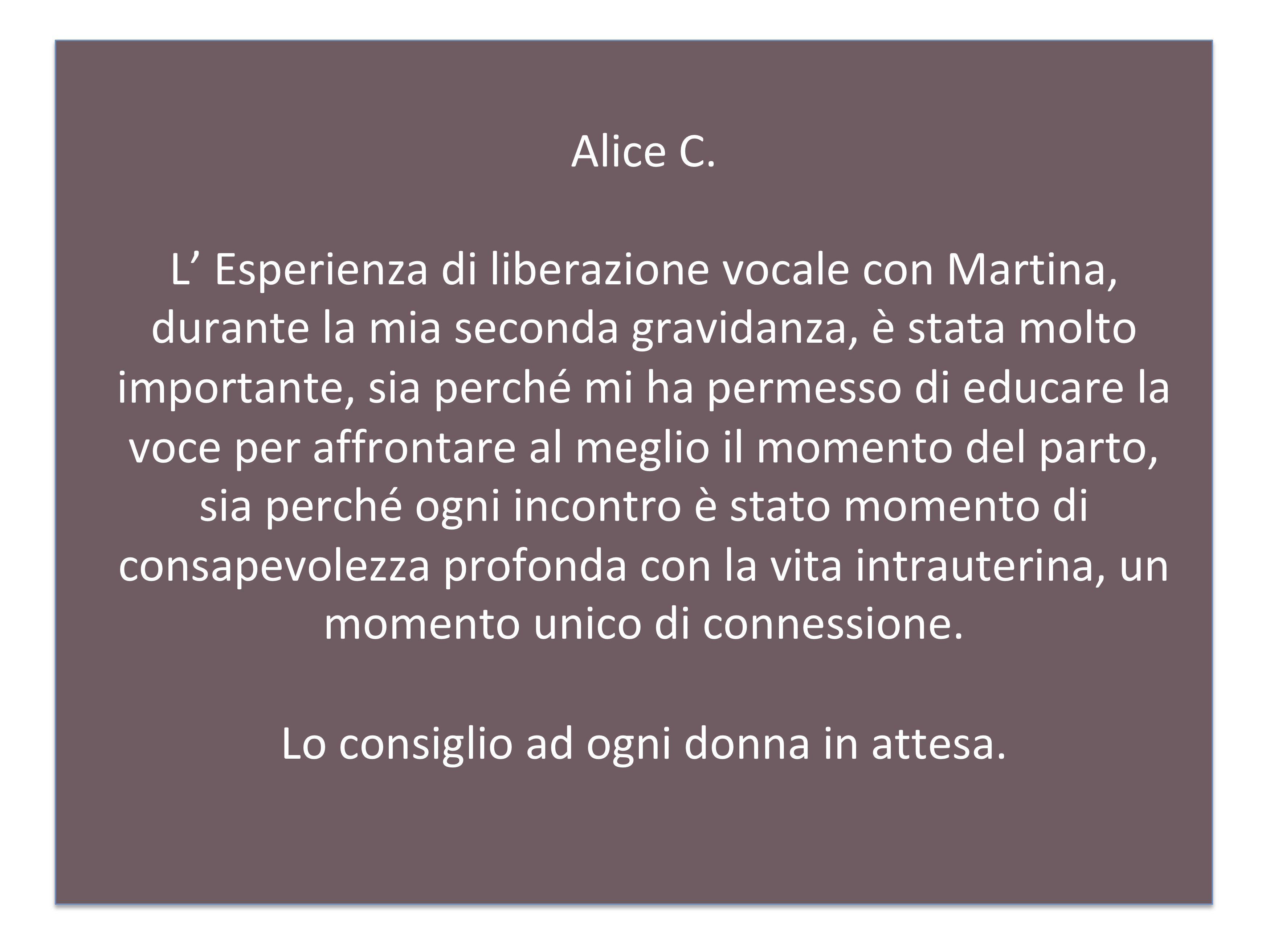 Già dal terzo mese di gestazione, il feto è in grado di percepire la tua Voce. Impariamo insieme a conoscerla e ad usarla con piacere perché sarà la prima cosa che la tua creatura sentirà e da cui sarà guidata nella sua crescita. La Voce cantata può creare un massaggio vibrazionale benefico per il feto. Il canto è un messaggio che nutre psicologicamente e musicalmente durante la sua crescita e sarà un canale di comunicazione affettivo di grande importanza anche dopo la nascita.